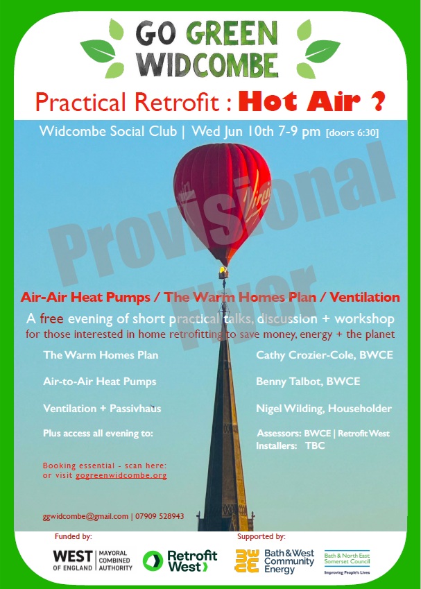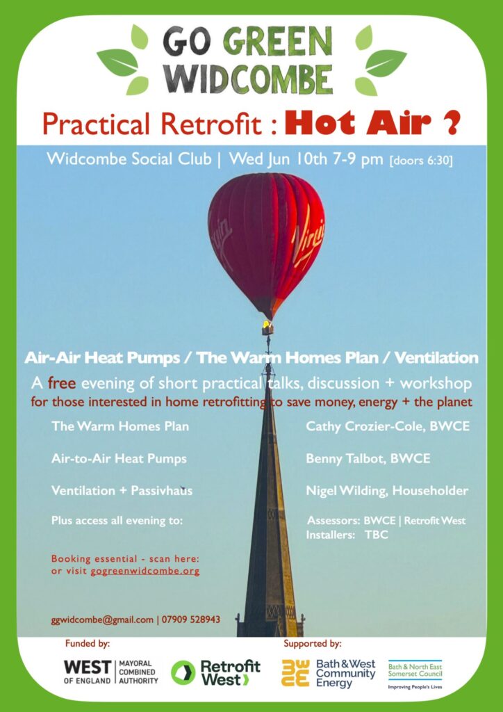 Go Green Widcombe’s current focus is to RETROFIT WIDCO2MBE! … by providing signposts to information about RETROFITTING HOMES to increase energy efficiency, aiming to tackle the current poor performance of homes…