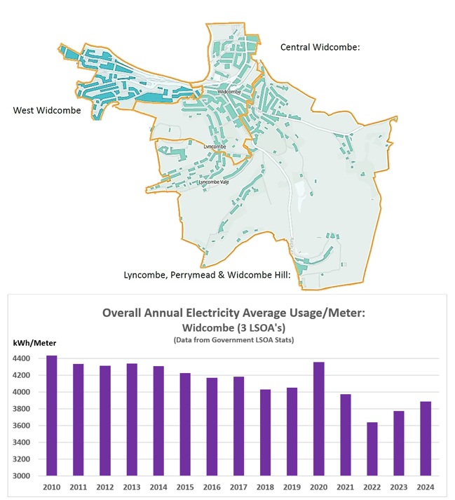This first graph shows the Overall Average Annual Electricity Usage (kWhr)/Meter across Widcombe. This data is from the Office for National Statistics (ONS), and it covers the period from 2010 to 2024. This data covers the 3 main areas of Widcombe (called LSOA’s or Lower Layer Super Output Areas): (a) West Widcombe, (b) Central Widcombe and (c) Lyncombe, Perrymead & Widcombe Hill. Overall, between 2010 and 2024, the Average Electricity Usage/Meter, across the whole of the Widcombe area has dropped by 12.3%, with a peak in 2020 (probably due to Covid, and people being home for much of the day).