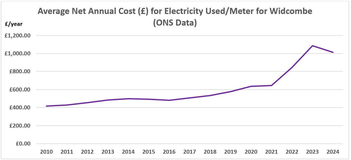The second graph calculates the estimated Annual Net Electricity Bill (£/Meter) across the same 3 main areas of Widcombe. This Average Selling Price (p/kWh) was obtained from this UK Govt website link… Historical electricity data: 1920 to 2024.